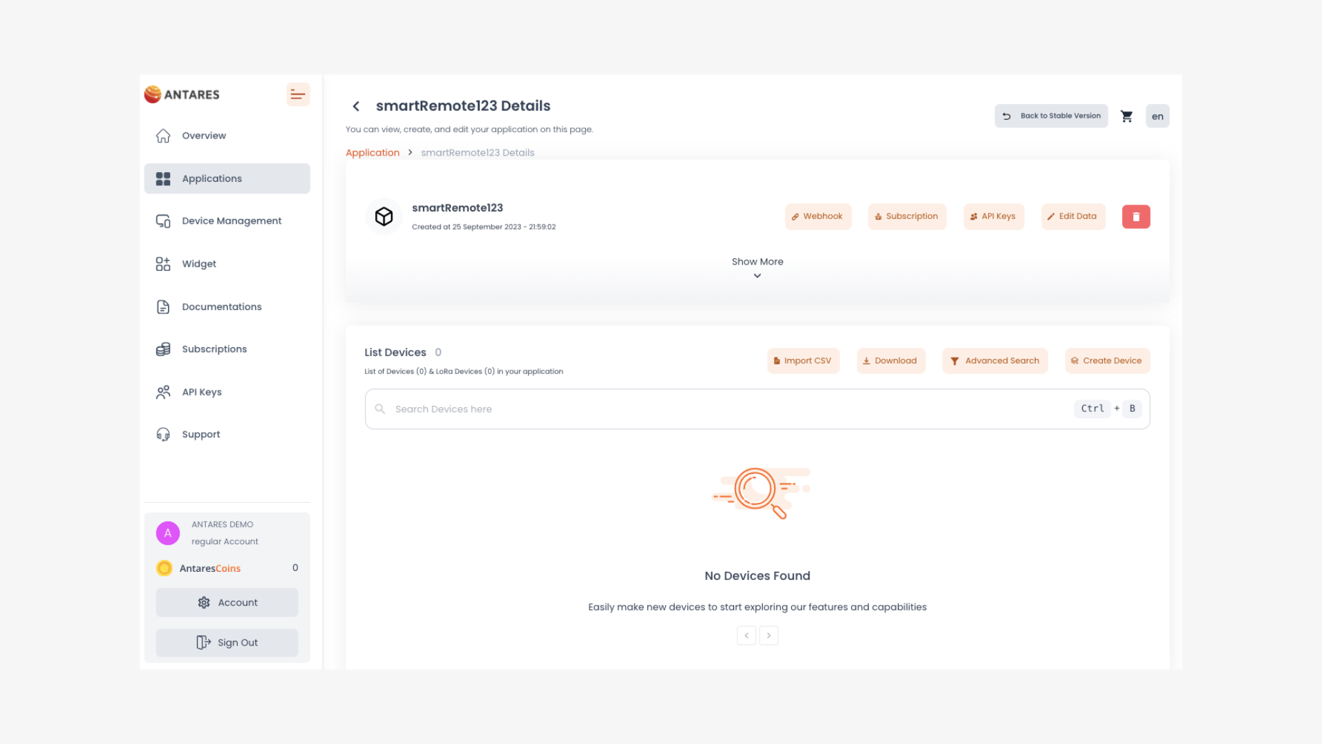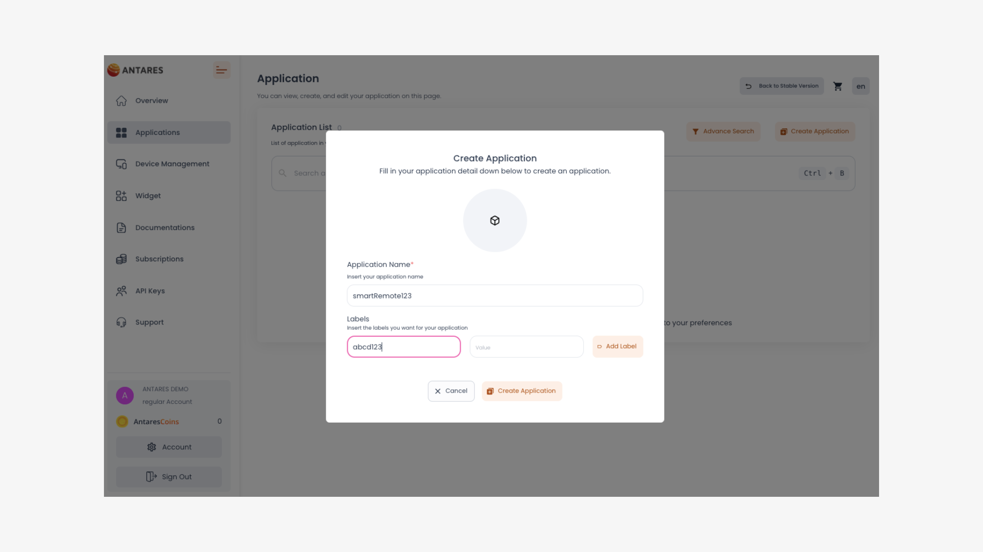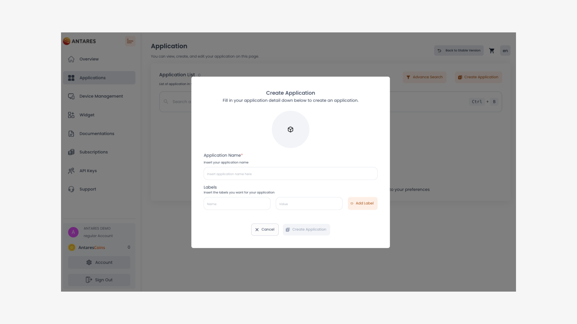 Before creating an application, you must **generate an access key**. This process is only done once if you are a new ANTARES user. You can find this option by visiting the menu **Account -> Access Key -> Get Access key**. Access Key is your account identity. Please keep your access key safe.