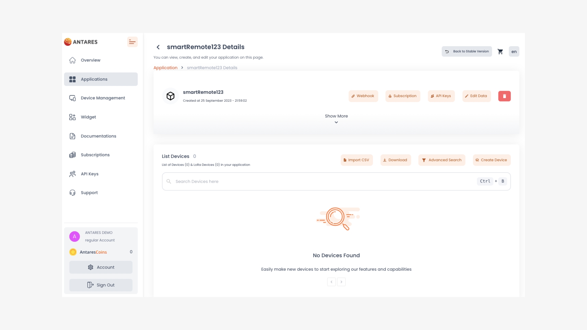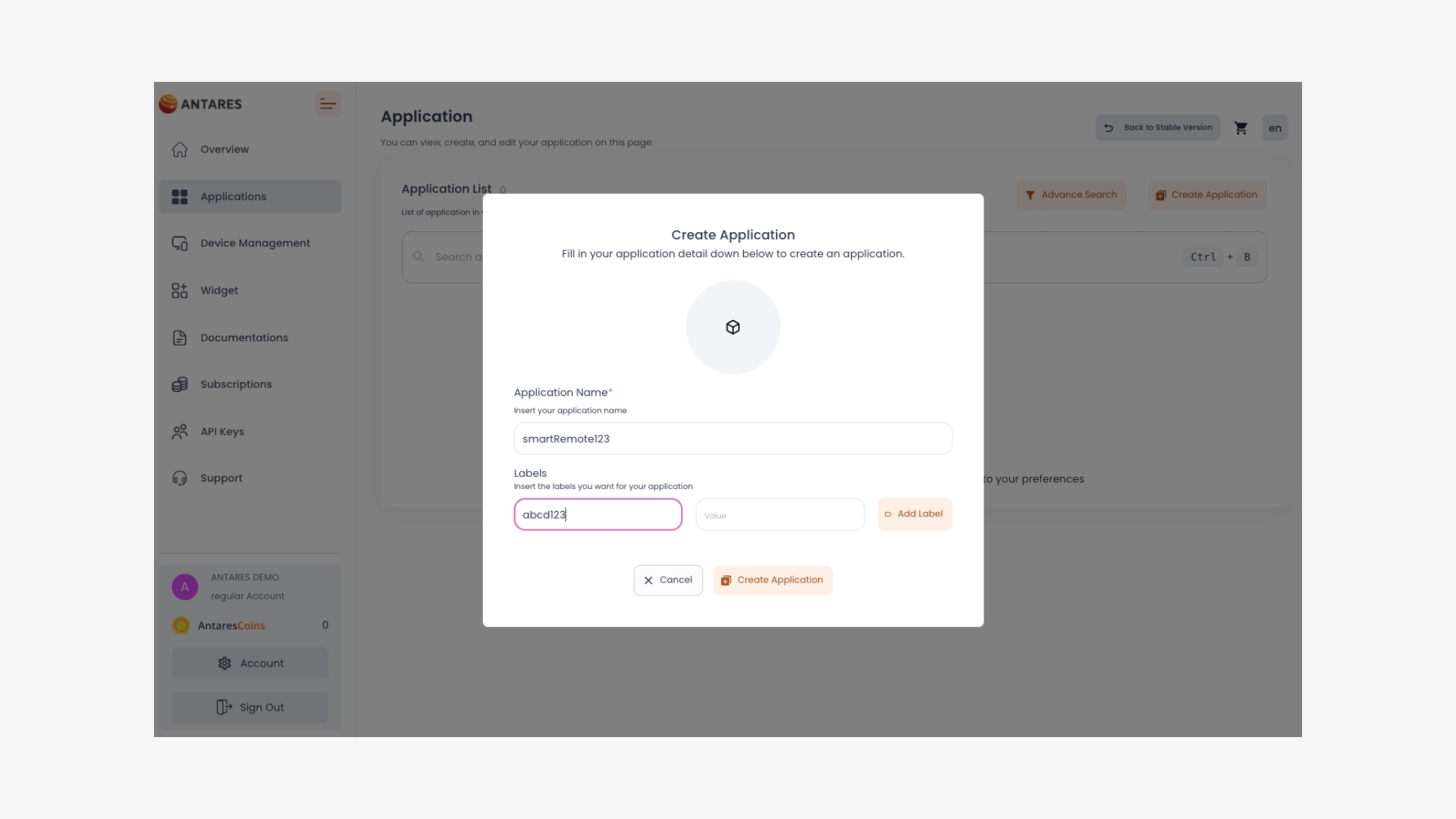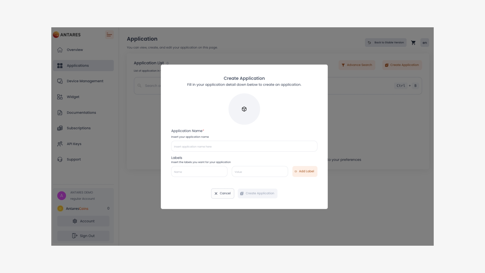 Before creating an application, you must generate an access key. This process is only done once if you are a new ANTARES user. You can find this option by visiting the menu Account -> Access Key -> Get Access key. Access Key is your account identity. Please keep your access key safe.