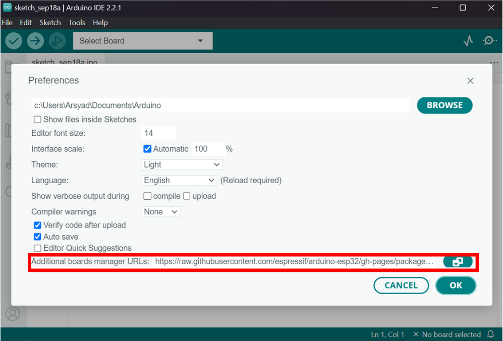 2. Enter the following URL into Additional Board Manager URLs and click OK.