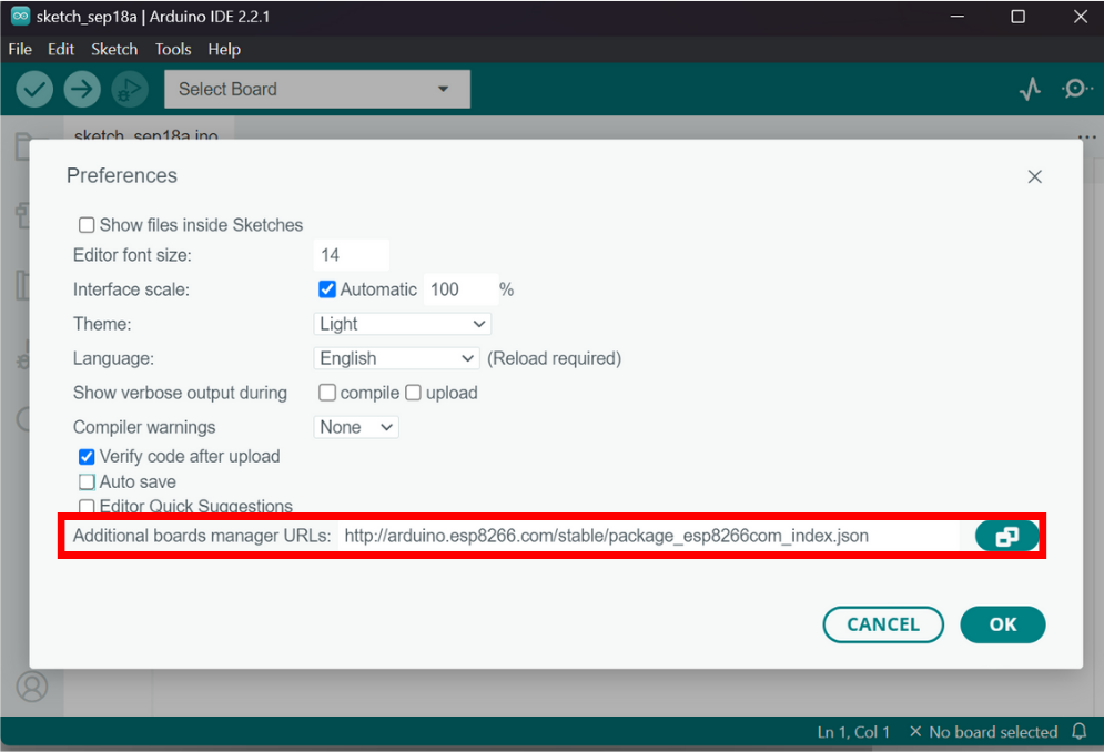 ### 2. Enter the following URL into Additional Board Manager URLs and click OK.