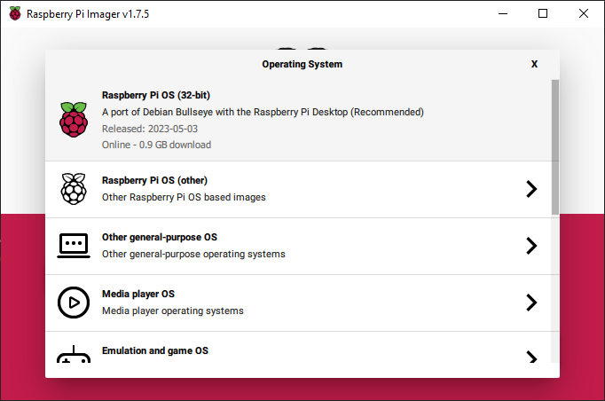 Here is the initial view of the newly opened Raspberry Pi Imager.