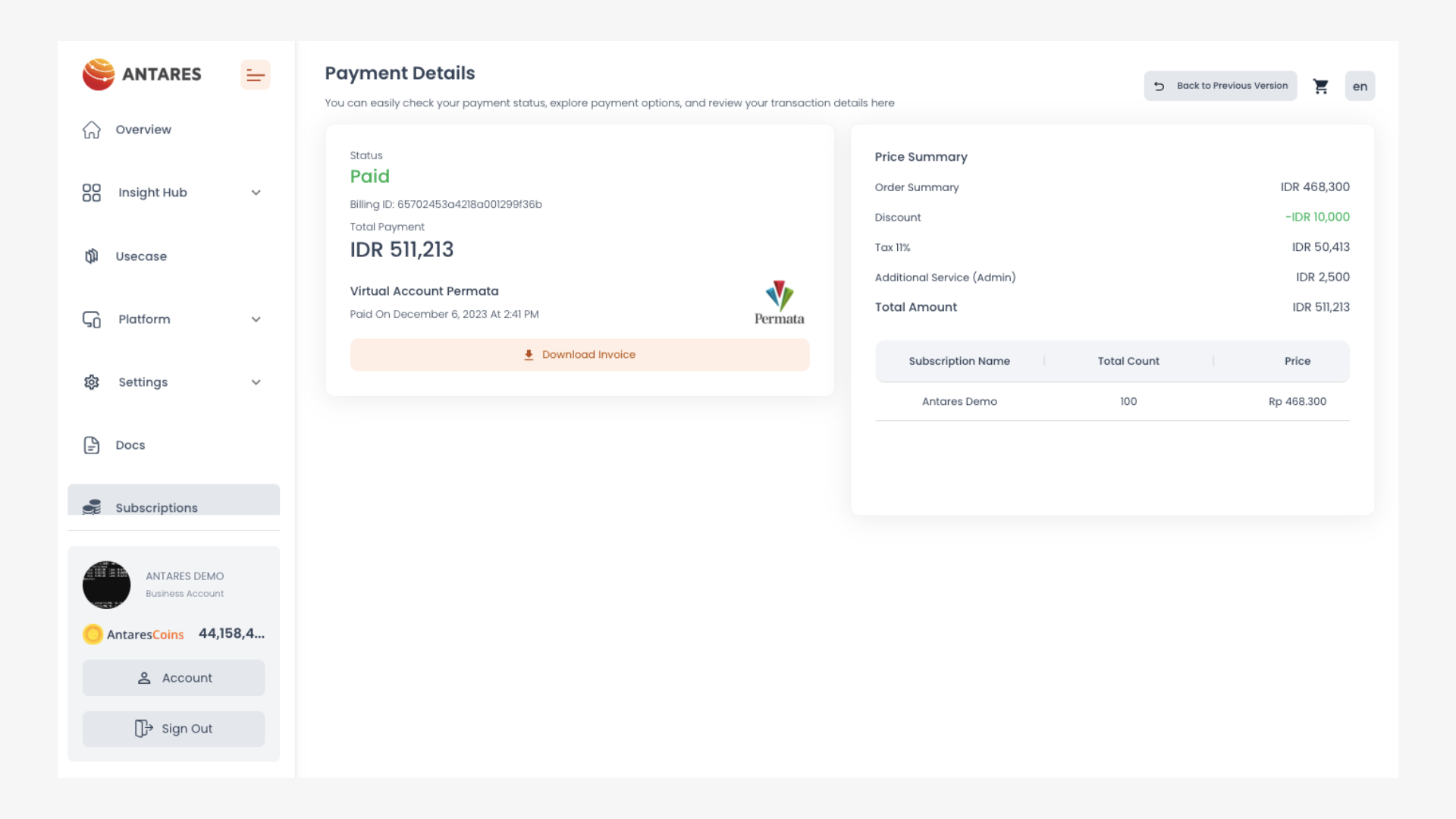 You will get a " Awaiting Payment" notification on the email registered to your Antares account. When the transaction process is complete, the display on the Antares page will change as shown below: