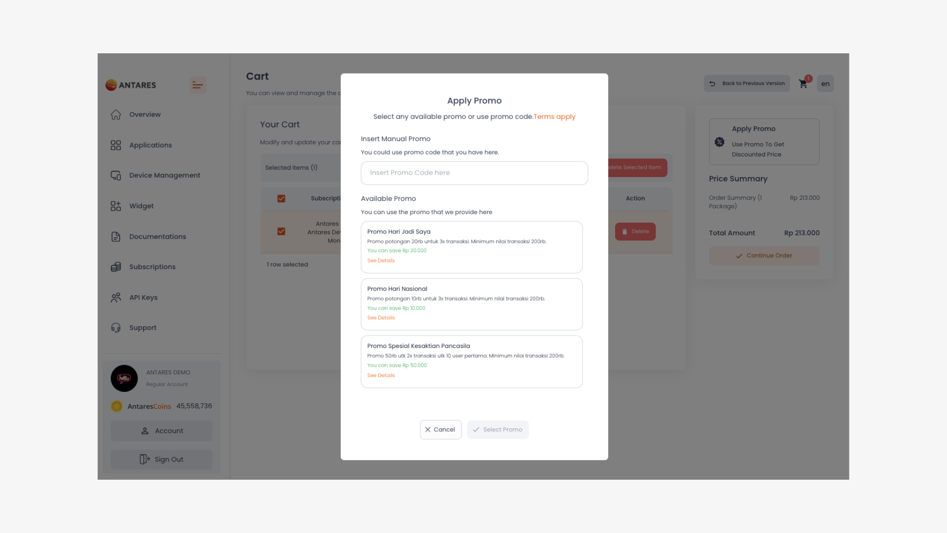 You have the opportunity to get a discount. You can see the applicable promo in the **"Apply Promo"** section before proceeding with the payment.