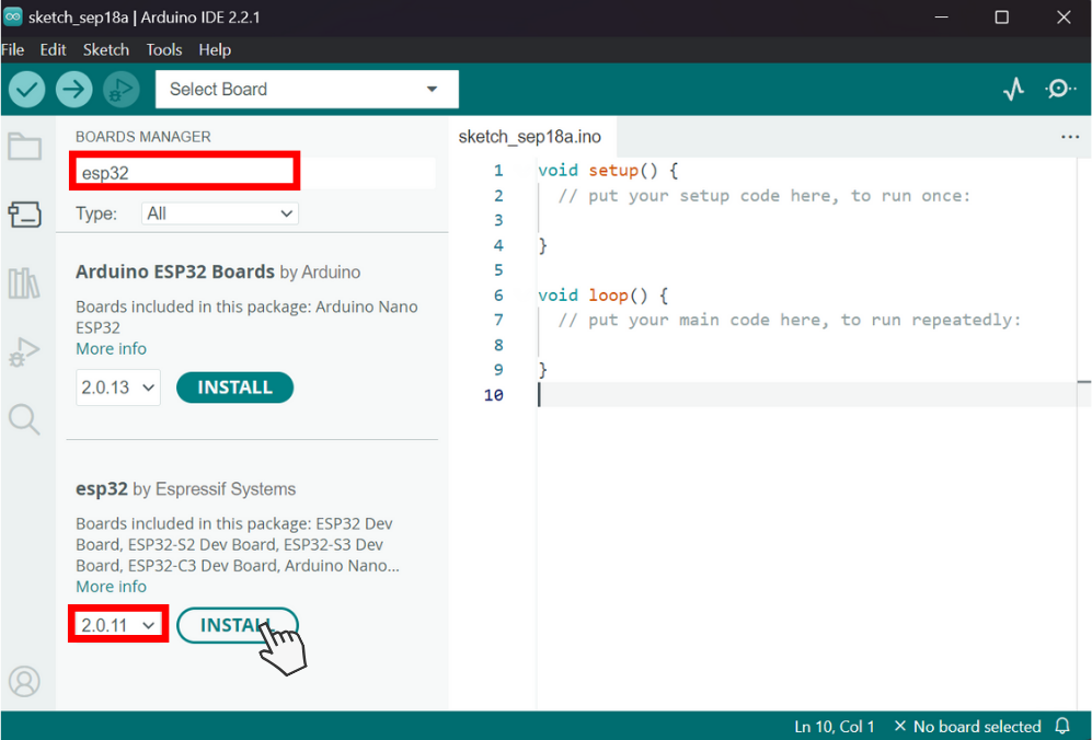 ### 4. Masukkan kata kunci "esp32" pada kotak pencarian untuk memudahkan Anda. Jika sudah menemukan esp32 by Espressif System, pada dokumentasi Antares disini menggunakan versi 2.0.11 dan kemudian klik Install.
