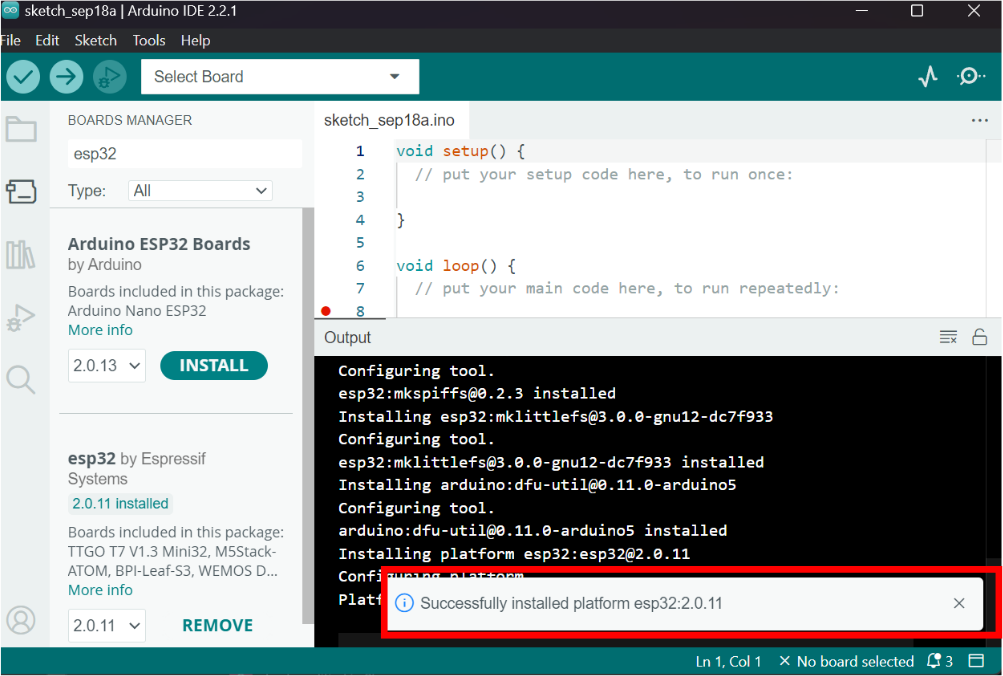 <figure><img src="https://content.gitbook.com/content/rRkxjRLeqOm0pNhLfsus/blobs/UyvZs7PBNtl7uHBxXiaD/Instalasi%20ESP32%20Berhasil.png" alt=""><figcaption></figcaption></figure>