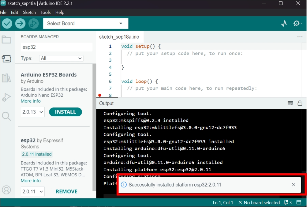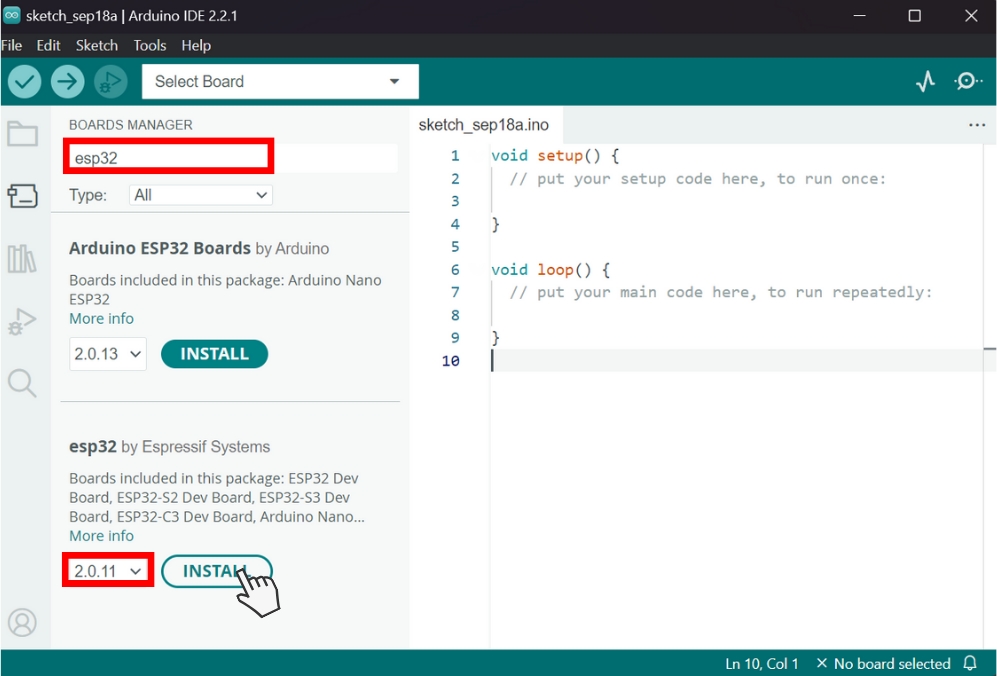 4. Masukkan kata kunci "esp32" pada kotak pencarian untuk memudahkan Anda. Jika sudah menemukan esp32 by Espressif System, pada dokumentasi Antares disini menggunakan versi 2.0.11 dan kemudian klik Install.