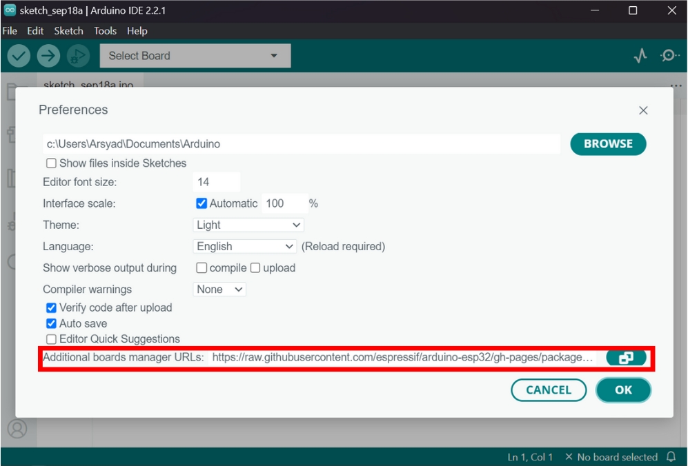 2. Masukkan URL berikut ke dalam kotak Additional Board Manager URLs kemudian klik OK.