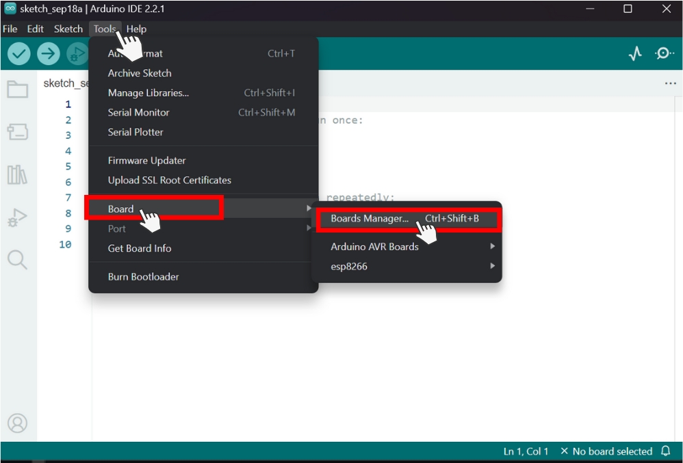 3. Pilih Tools -> Board -> Boards Manager