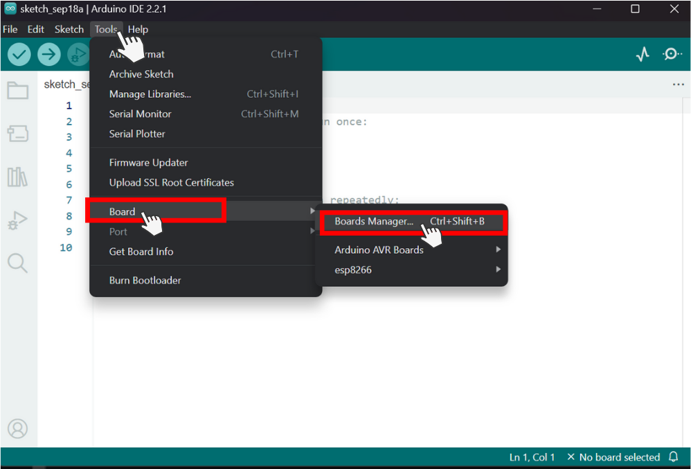 ### 3. Pilih **Tools -> Board -> Boards Manager**