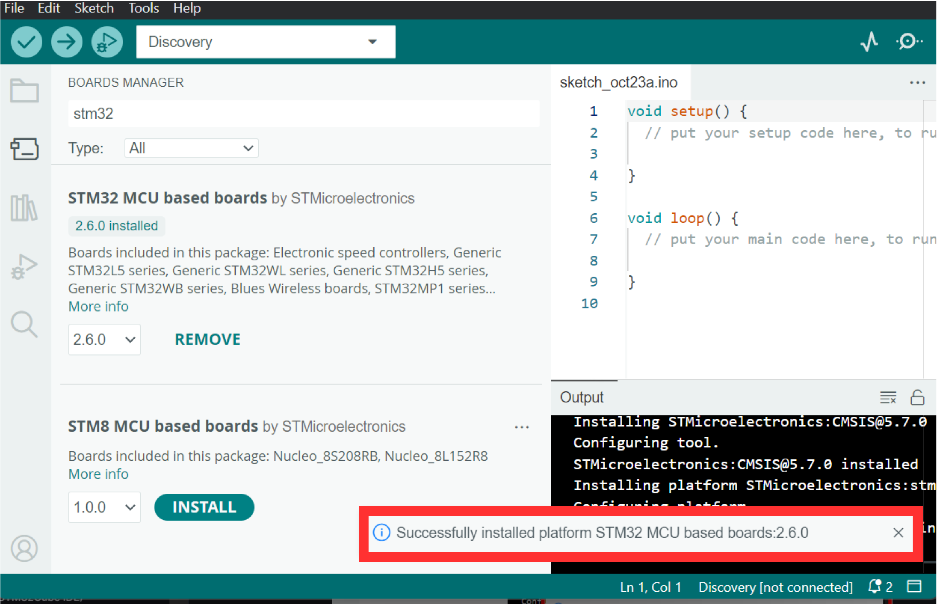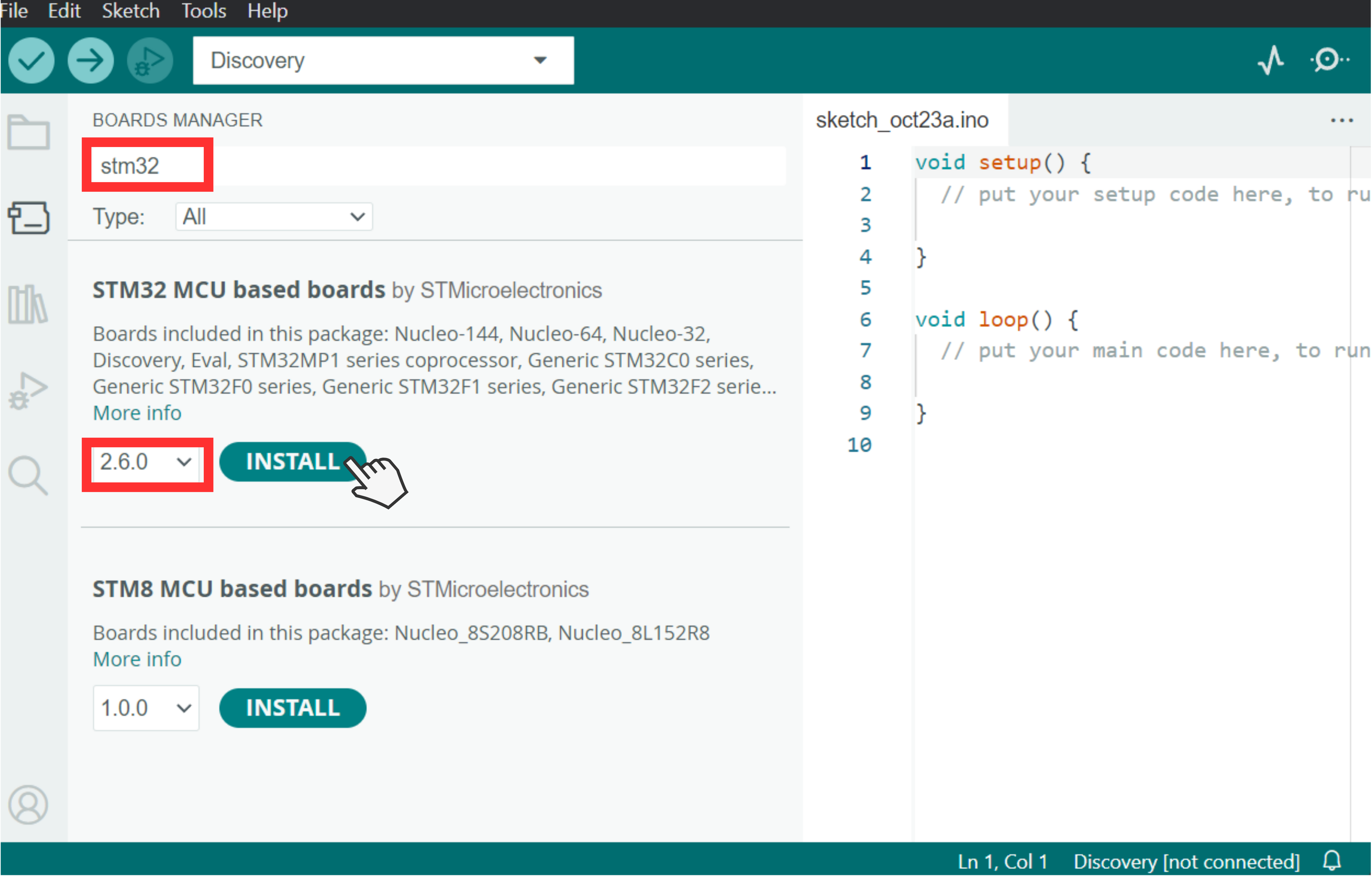 ### 4. Masukkan kata kunci "stm32" pada kotak pencarian untuk memudahkan Anda. Jika sudah menemukan STM32 MCU based board by STMicroelectronics, pada dokumentasi Antares disini menggunakan versi 2.6.0 dan kemudian klik Install.