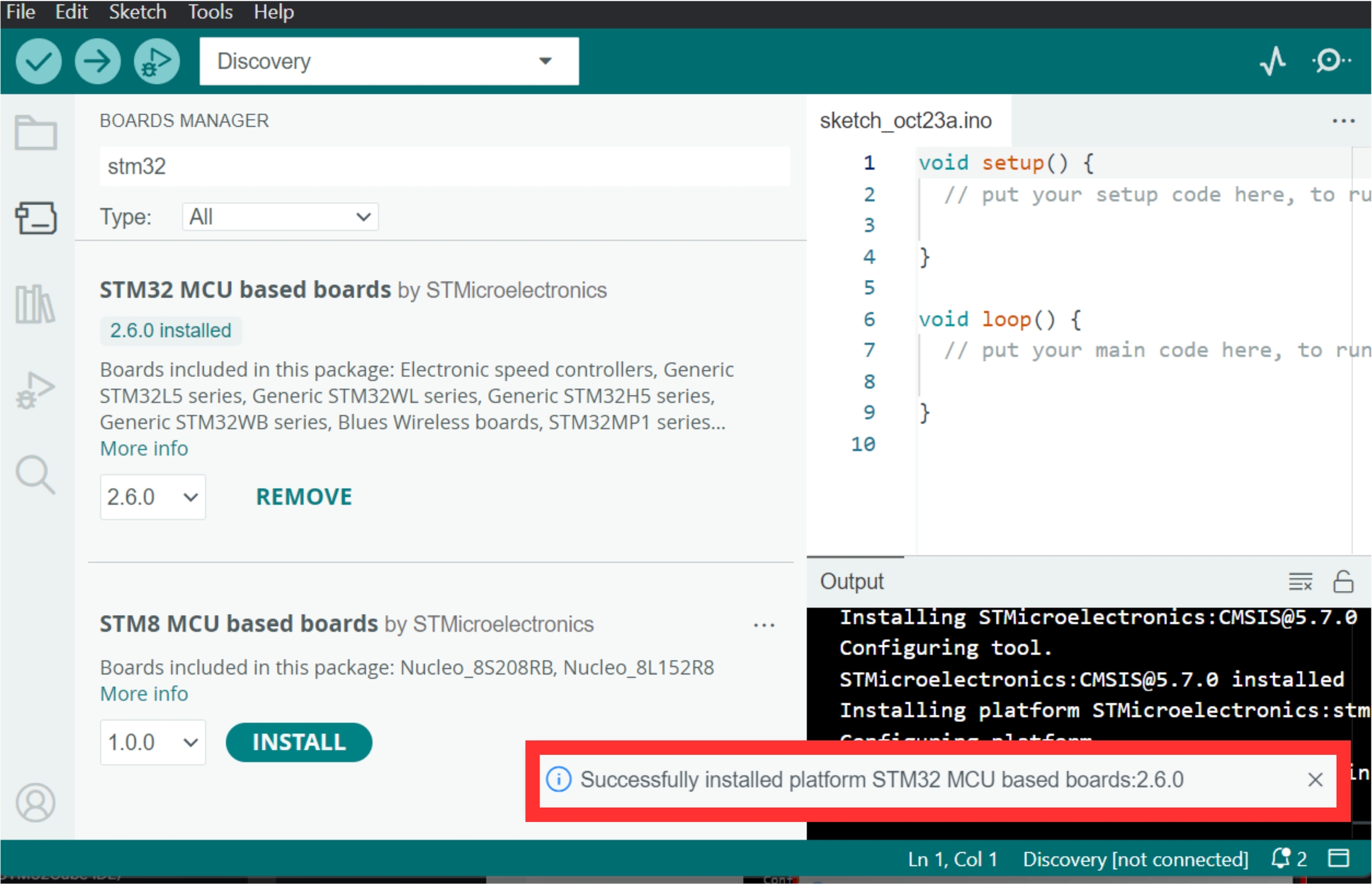 4. Masukkan kata kunci "stm32" pada kotak pencarian untuk memudahkan Anda. Jika sudah menemukan STM32 MCU based board by STMicroelectronics, pada dokumentasi Antares disini menggunakan versi 2.6.0 dan kemudian klik Install.