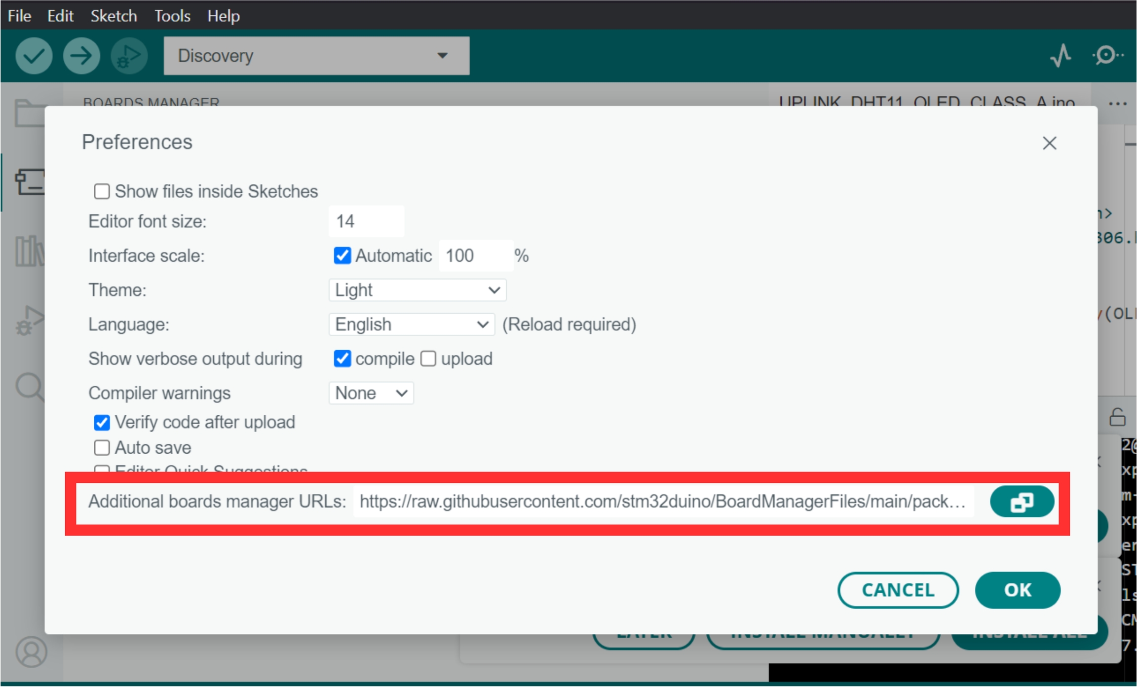 2. Masukkan URL berikut ke dalam kotak Additional Board Manager URLs kemudian klik OK.