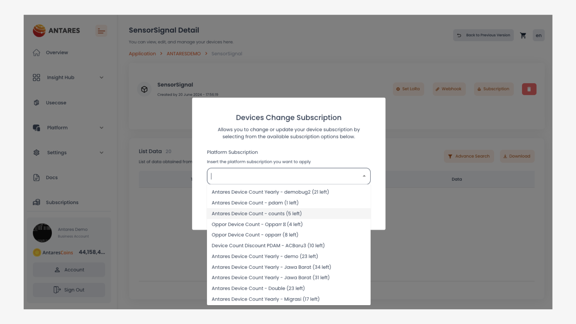 Klik tombol **"Subscription"** yang berada pada bagian kanan atas halaman device.&#x20;